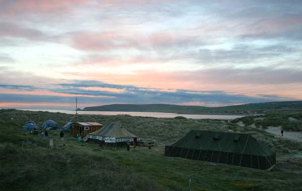 Rossport Solidarity Camp re-opened on the 25th of February 2006. Whereas in 2005 the camp was located on the route of the pipeline in Rossport, it was decided that this year’s camp would be located on the landfall of the pipeline, on the beach at Glengad. On the weekend of the 25th over thirty Shell to Sea supporters from across the country assisted campers and Rossport residents in the construction of the camp. A marquee and several benders (structures made from bent hazel poles) were constructed that weekend and in the subsequent weeks we have built more benders, compost toilets, food composting facilities, a grey water system, pathways, and a kitchen.