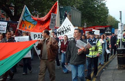 Most of the participants were young with the older ones coming from a variety of organised groups, the parties of the far left, anarchists of the WSM, Palestine solidarity groups, the Green Party and various religious groups both Islamic and Christian. There was also a small group of 'US Citizens against the war'. Unlike the earlier anti-war and freedom for Palestine marches of this year there was no visible Islamic fundamentalist presence, no 'God is great' chants and only one obviously anti-Semitic placard.