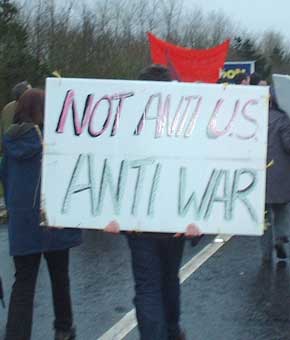 The demonstration was called by the SWP created 'Irish Anti War Movement'. It opposes direct action but on the bus on the way to Shannon we had been told that on this occasion they had no wish to try to prevent others carrying out such actions. The reality though was that although there had been some discussion of possible direct actions in advance of Shannon (and more on the bus on the way down) no real preparation work had been done. And on the day itself despite a couple of attempts to get a large group together to discuss this nothing concrete was organised.