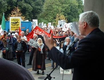 The march took a longer route than usual arriving at the Department of Foreign Affairs on Stephens Green where a short rally was staged with speakers including Joe Higgins of the Socialist Party, Daith' Doolan of Sinn Féin and one from some concerned American citizens group. (Other speakers included Michael D. Higgins (Labour Party), Trevor Sargeant (Green Party), and a Palestinian).