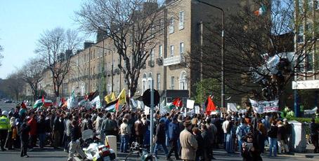 The end result was that about half of those present spontaneously formed up and marched to the embassy via Grafton St and Baggot St. As the march progressed there was quite a bit of chanting in Arabic, mostly along the line of 'Sharon is a butcher' and 'Freedom for Palestine'. Somewhere between 500 and 800 people arrived at the embassy where they were yet more speakers and yet more 'God is great chants' before the crowd was asked to break up and return home.