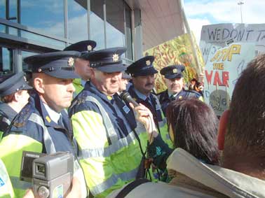 On reaching the airport buildings there was a token effort to march into the terminal, easily blocked by the 60 or so Gardai in front of and around the doors. There was a stand off there for a while as the (SWP*) stewards tried to get people to move on so we could 'listen to the speeches'. Apparently this was very important to 'explain why we were there'. After a while they got everyone to sit down instead and so we got to listen to many speeches quite similar to the ones we had heard on other anti-war demonstrations. There was one exception when an Iraqi women spoke about her feelings about the war but otherwise even the speaker line up was almost remarkably similar to the last anti-war demonstration in Dublin, all of two weeks ago.
