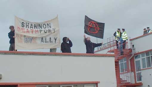 The major success of the day was the number of people who turned up at Shannon for the demonstration. Providing a sensed of momentum can be kept going there is no reason why future demonstrations should not continue to grow as more and more people decide it is time for them to come out. The direct action, although very scrappy in this case, is vital to this sense of momentum. Not everyone was happy with it (one man was shouting that he wanted the TV cameras to be on him and not on the rooftop protesters!!) but this is a reason for making the arguments for direct action clear to all that are attending these demonstrations.